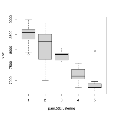 You can also perform environmental analyses of the clusters using the various plotting techniques we have developed. For example, to look at the distribution of plot elevations within clusters, we can do a boxplot as follows (assuming that the site data are already attached):