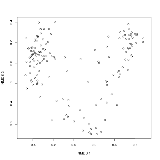 In contrast to PCO, there is not a single best algorithm for achieving the maximum correlation, and many algorithms have been developed as solutions to this problem. We will focus on just one: Kruskal's non-metric multidimensional scaling (or NMDS). Kruskal's NMDS attempts to minimize something called "stress", the square root of the ratio of the squared differences between a monotonic transformation of the calculated dissimilarities/distances and the plotted distances and the sum of the plotted distances squared. It sound more complicated than it is. Essentially, it tries to maximize the rank correlation between the calculated dissimilarities/distances and the plotted distances, allowing tied distances to not have identical plotted distances, only sequential ranks.