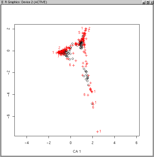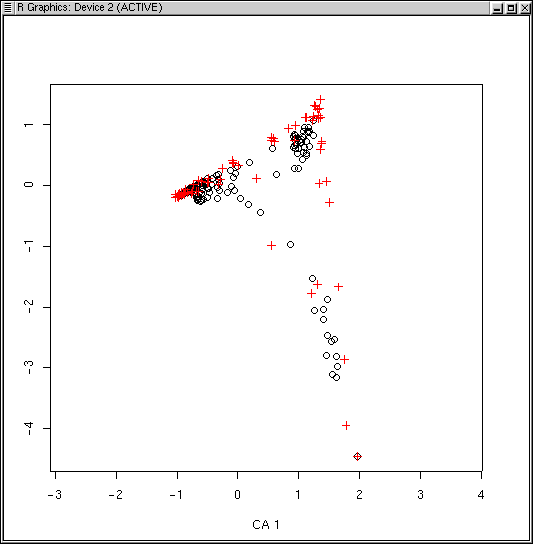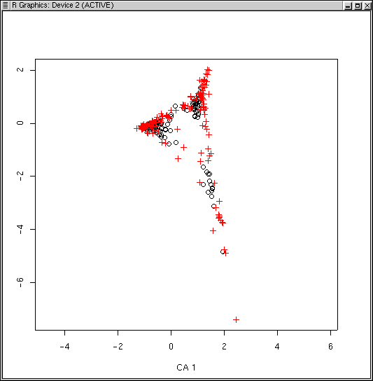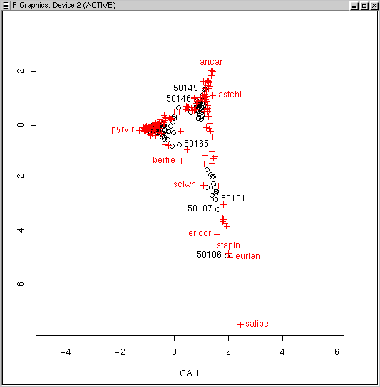 The LabDSV convention is to plot samples in black (as for PCA, PCO, and NMDS) and species in red (in a different symbol as well) as shown. CA is known to be sensitive to rare species and outlier plots, and what you see is an indication of that. One species (to be identified later) is an extreme outlier on the y axis, and since the x axis is scaled to maintain an aspect ratio of 1.0, condenses the plots and species along both axes. To identify the offending species, we can use the specid.ca() function. Similar to how we used identify() way back in Lab 1, specid.ca() works similarly. Call specid.ca() with an argument to specify the CA and the scaling, and optionally a vector of species names as follows.