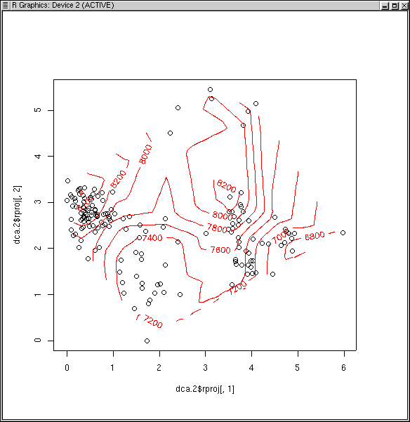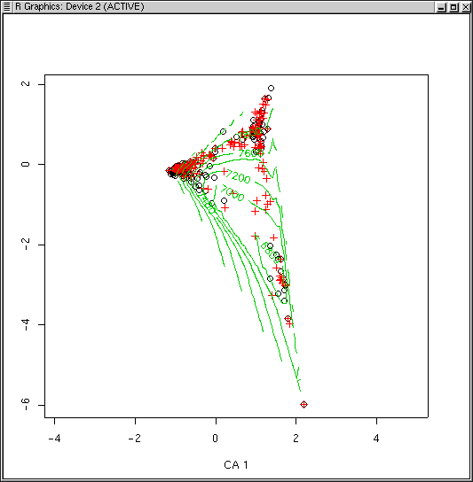 Because the CA plot program uses two colors already, the default for surf() for CA is to plot contours in green (col=3) to start. Despite the fact that the graph is not very interpretable visually, the D^2 square is not too bad (0.617 vs 0.870 for PCO). Surfaces for slope and aspect value (see Lab 8 are not very satisfactory either, despite reasonable D^2s. In fairness, the Bryce data set probably has too much beta-diversity for CA. Although less sensitive then PCA, CA also suffers when applied to high beta-diversity.