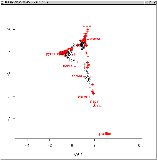 In contrast to the ordination methods we have employed so far, CA provides a configuration for species as well as sample plots in the ordination. That is, species centroids (the hypothetical mode of their distribution along the eigenvectors) can be plotted as well as the locations of the plots. This dual nature is one of the characteristics that first attracted ecologists to CA.