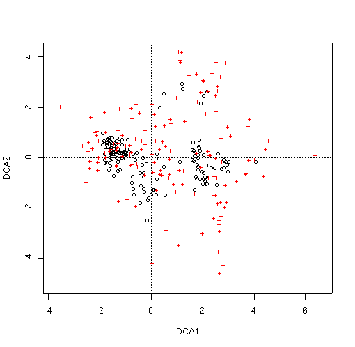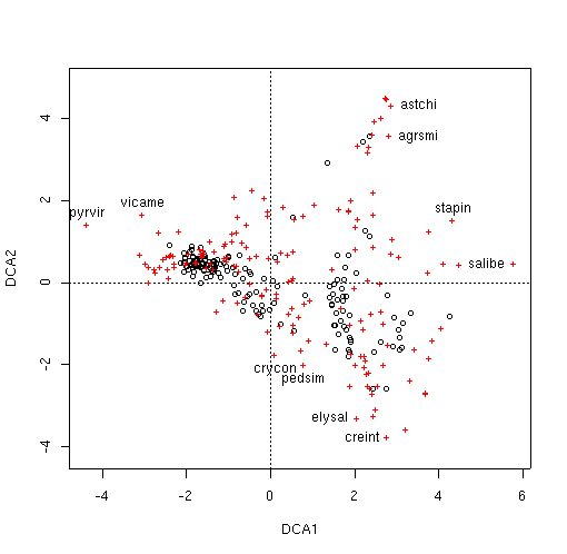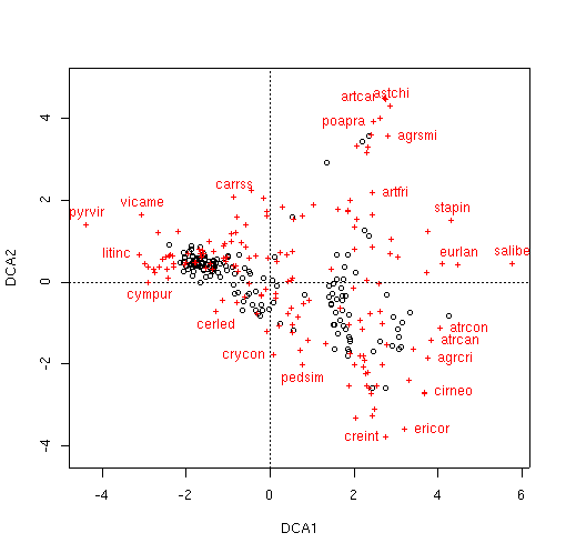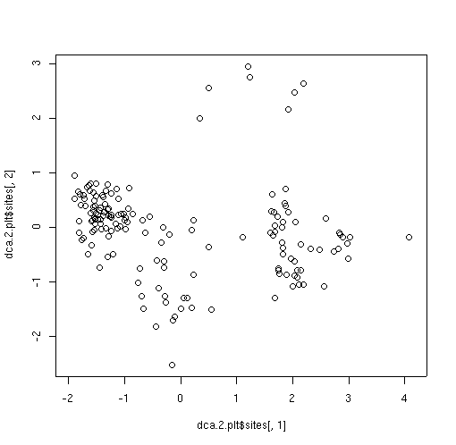 library(vegan) # if you haven't already veg.dca <- decorana(veg) veg.dca.plt <- plot(veg.dca) # notice the assignment used with a plot function