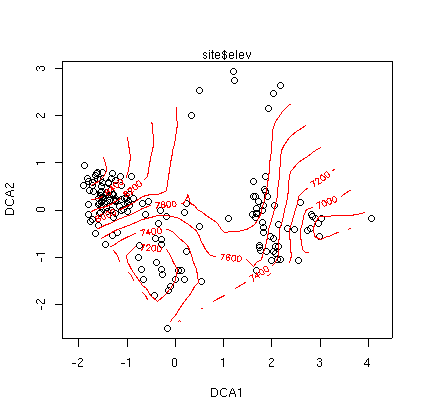 To produce an ordination with vegan, you simply call an ordination function like you did with LabDSV, storing the result in an ordination object. To plot the ordination, you can simply plot is, again like LabDSV. Generally, however, you will want to store the (invisible) result of the plot in another variable. This variable has class "ordiplot," and stores all the information about the plot, such as which axes were plotted, and the coordinates of sites and species on just those axes, not all. This greatly simplifies subsequent labeling and surfacing, as the routines now magically know which axes were plotted, as well as some other information. Let me give an example using decorana