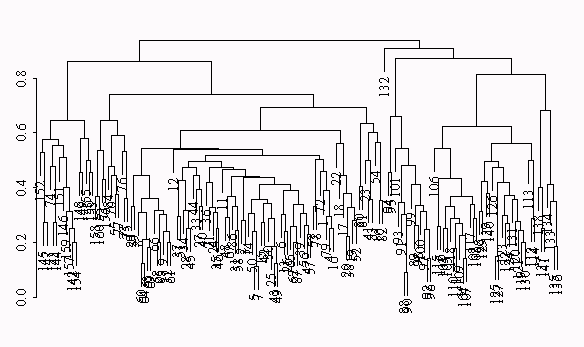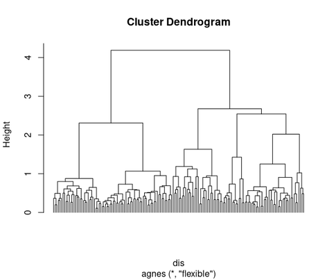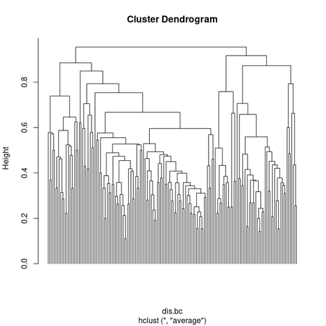 hcl.fb <- flexbeta(dis.bc,beta=-0.25) plot(hcl.fb,hang=-1,labels=FALSE)