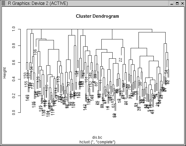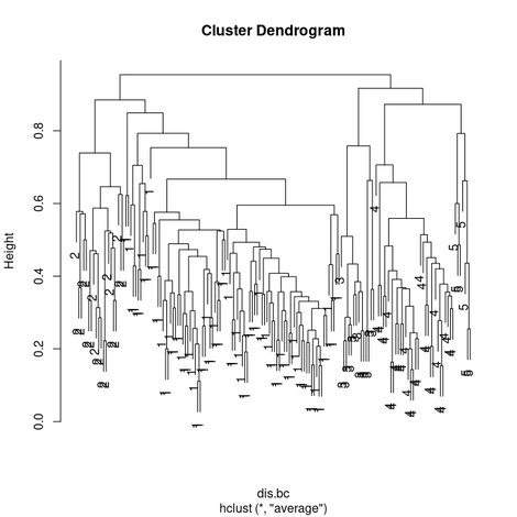 As another example, I'll use complete on the Bray/Curtis dissimilarity calculated in a previous lab and then follow with const()