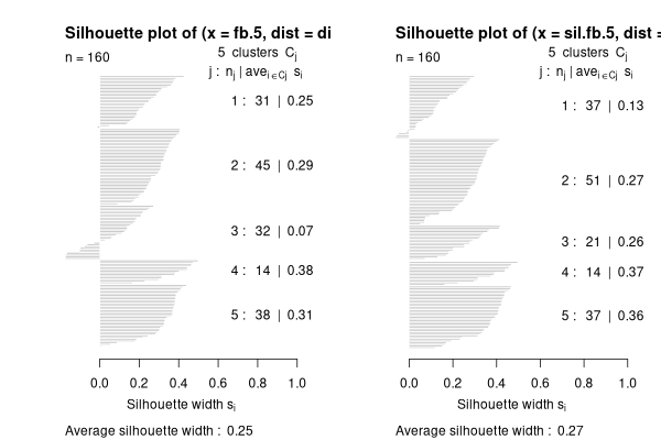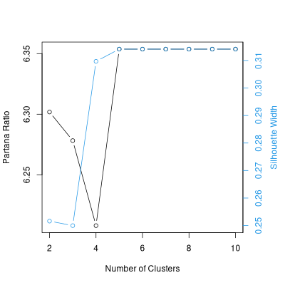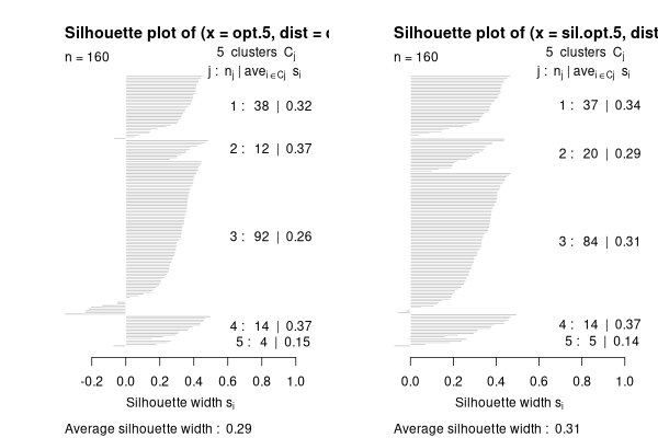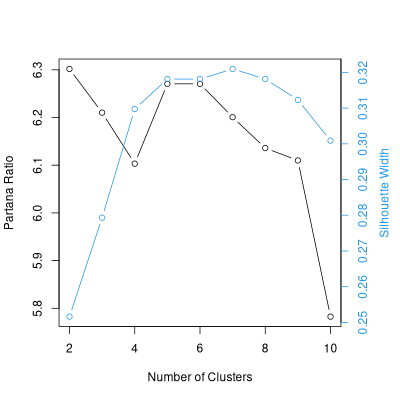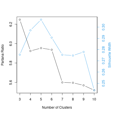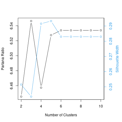 clusters sil_width 1 3 0.2754676 2 4 0.2971435 3 5 0.3066199 4 6 0.2906381 5 7 0.2753434 6 8 0.2747093 7 9 0.2778687 8 10 0.2438136