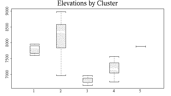 You can also perform environmental analyses of the clusters using the various plotting techniques we have developed. For example, to look at the distribution of plot elevations within clusters, we can do a boxplot as follows (assuming that the site data are already attached):