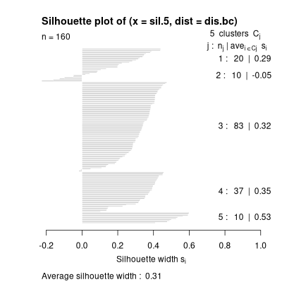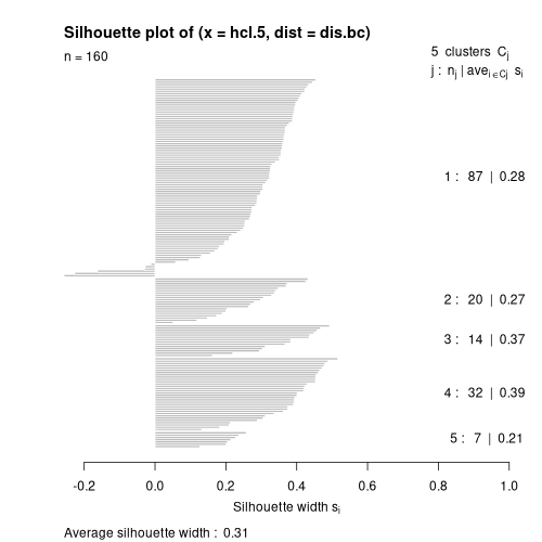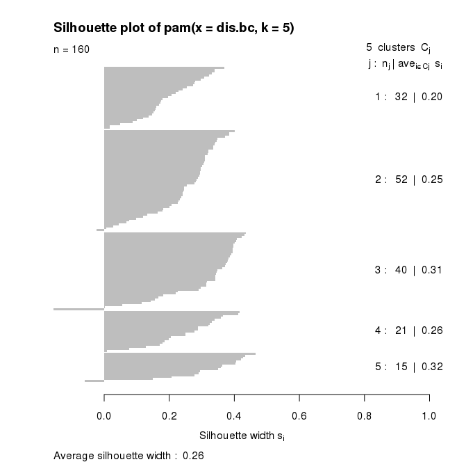 pam.5 <- pam(dis.bc,k=5) attributes(pam.5)