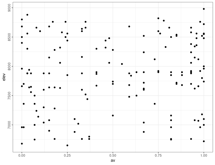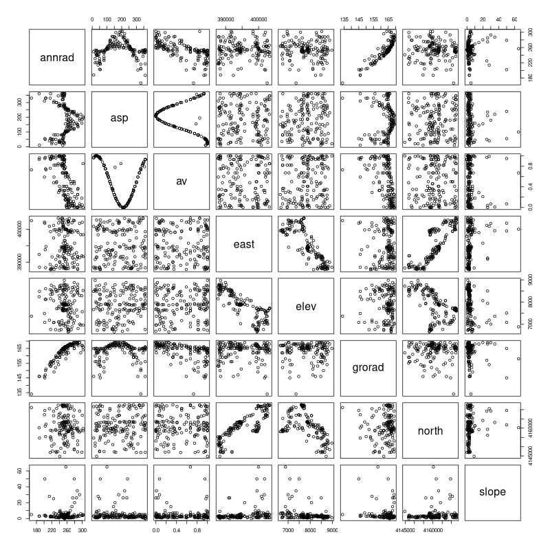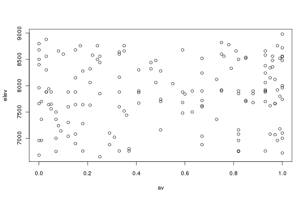 The joint distribution of elevation and aspect values is pretty good, and we should be able to employ both variables in analyses without worrying about correlation problems. If desired, the actual correlation can be tested easily.