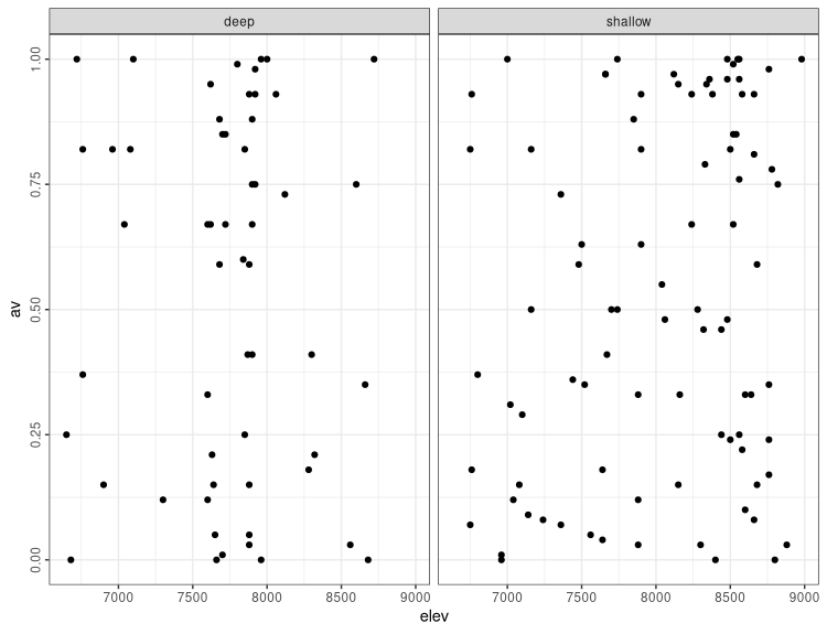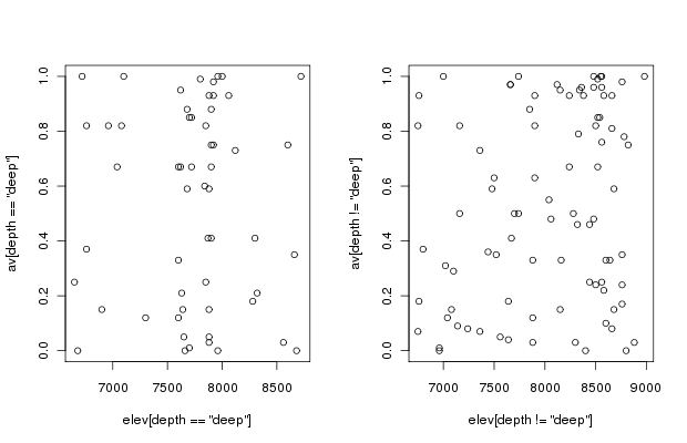 data: elev[depth == "deep"] and elev[depth != "deep"]