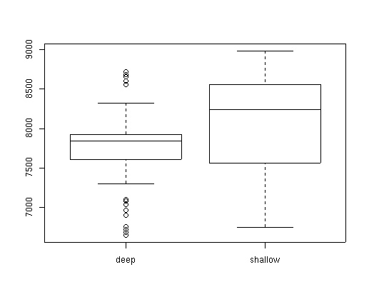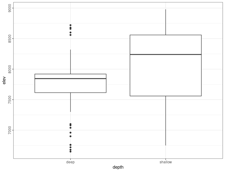 The syntax of the boxplot() function is interesting, and is something we'll see often in other contexts. The ~ character is R for "as a function of" so that boxplot(elev~depth) means plot elev as a function of depth. The boxplot will plot one box for each possible value of depth, which in this case is only two. Later on we'll see many examples of ~ meaning "as a function of."