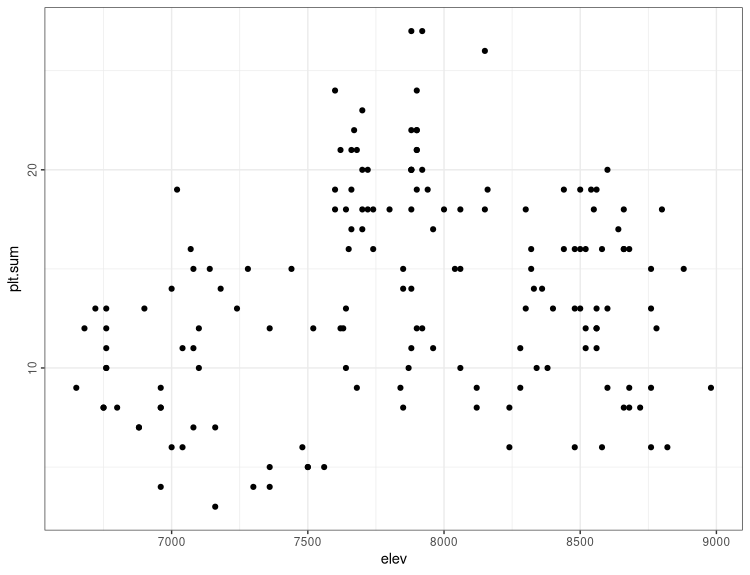 ggplot(site,aes(elev,plt.sum)) + geom_point() # to see if total cover varies as a function of elevationorgf_point(plt.sum~elev,data=site)