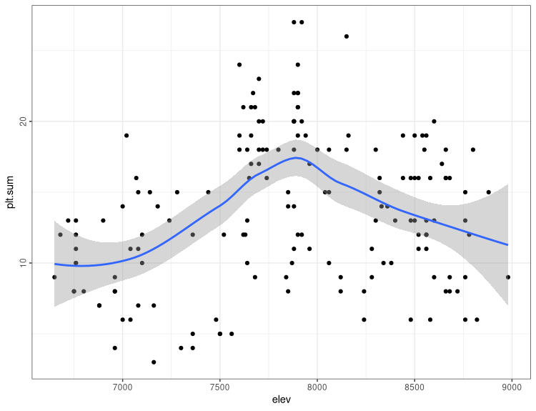 orggplot(site,aes(elev,plt.sum)) + geom_point() + geom_smooth()p <- gf_point(plt.sum~elev,data=site) gf_smooth(p,se=TRUE)I won't attempt to explain all of that line in this lab, but it is a plot of a LOESS smoother of plot cover to elevation.
