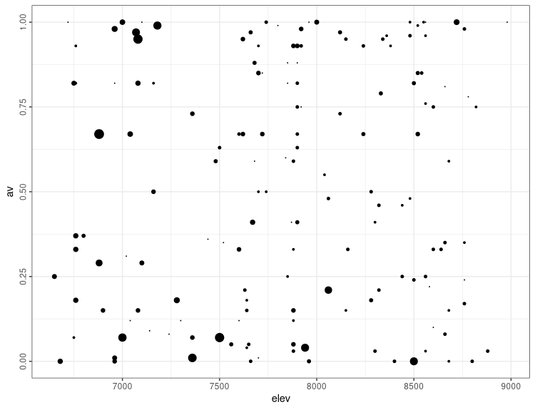 By varying the size of the plotted symbol, we can add dimensions to the plotted data easily. For example, the plot below has elev on the X axis, av on the Y axis, and slope plotted in different sized symbols.