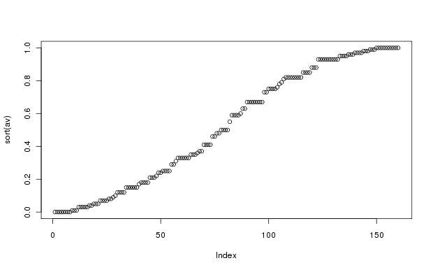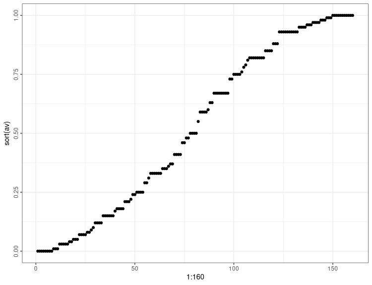 geom_line(aes(1:160,seq(min(elev),max(elev),len=160)),col='red')command is an example of adding points or lines to an existing plot.orggplot(site,aes(1:160,sort(av))) + geom_point() # to see aspect value = (cos((asp-30)/180*pi)+1)/2gf_point(sort(av)~1:160)![]()