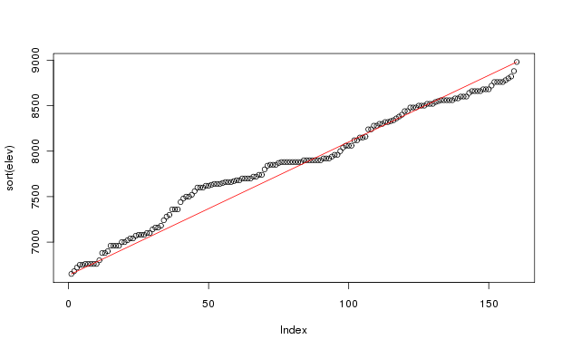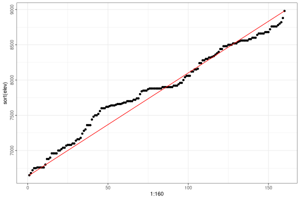 orp <- ggplot(site,aes(1:160,sort(elev))) + geom_point() p + geom_line(aes(1:160,seq(min(elev),max(elev),len=160)),col='red')gf_point(sort(elev)~1:160) gf_line(p,seq(min(elev),max(elev),len=160)~1:160,data=site,col='red')As you can see, the elevations of the sample plots are fairly uniformly spread from 6650 feet to 8980 feet (2027 to 2737 m). (Calculate elevm <- elev * 0.3048 to convert feet to meters). There are a few too few sample plots below 8000 feet, but the sample stratification took into account the variability of the vegetation by elevation, and lower elevations required fewer plots to represent them sufficiently. The