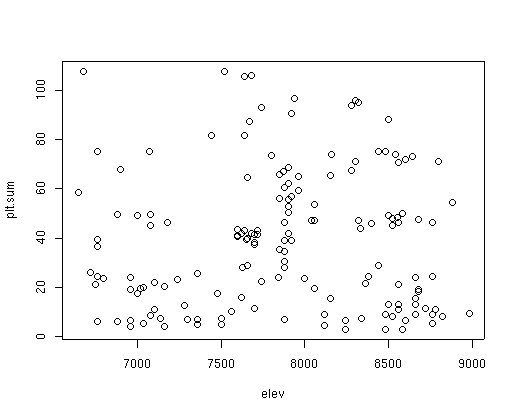 As you can see, the elevations of the sample plots are fairly uniformly spread from 6650 feet to 8980 feet (2027 to 2737 m). (Calculate elevm <- elev * 0.3048 to convert feet to meters). There are a few too few sample plots below 8000 feet, but the sample stratification took into account the variability of the vegetation by elevation, and lower elevations required fewer plots to represent them sufficiently. The