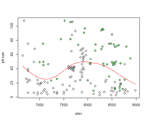 lines(sort(elev),fitted(gam(plt.sum~s(elev)))[order(elev)],col=2)I won't attempt to explain all of that line in this lab, but it is a plot of a Generalized Additive Model (GAM) fit of plot cover to elevation. It's significant (P<0.001), but not terribly strong (pseudo R^2 = 0.13). We can highlight specific sample plots in the figure as follows: