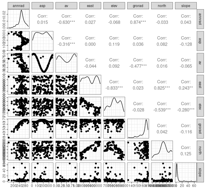 names(brycesite)To repeat the pairs analysis we did in base R you need to load library GGally.[1] "plotcode" "annrad" "asp" "av" "depth" "east" [7] "elev" "grorad" "north" "pos" "quad" "slope"library(GGally) ggpairs(brycesite[,c(2:4,6:9,12)])![]()