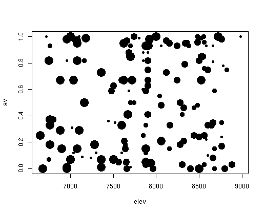 plot(elev,av,type='n') # plot with no symbols type='n') points(elev[slope<2],av[slope<2],pch=16,cex=0.75) # plot the first quartile in small symbols points(elev[slope>=2&slope<3],av[slope>=2&slope<3],pch=16,cex=1.5) # plot the second quartile slightly larger points(elev[slope>=3&slope<5],av[slope>=3&slope<5],pch=16,cex=2) # third quartile larger yet points(elev[slope>=5],av[slope>=5],pch=16,cex=3) # last quartile largest![]()