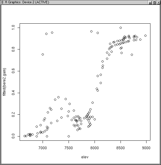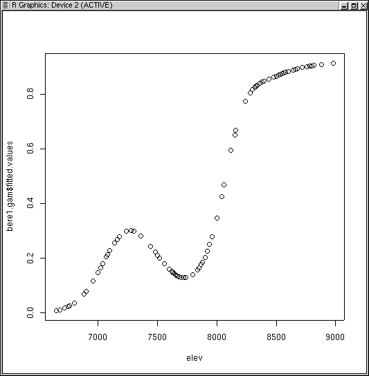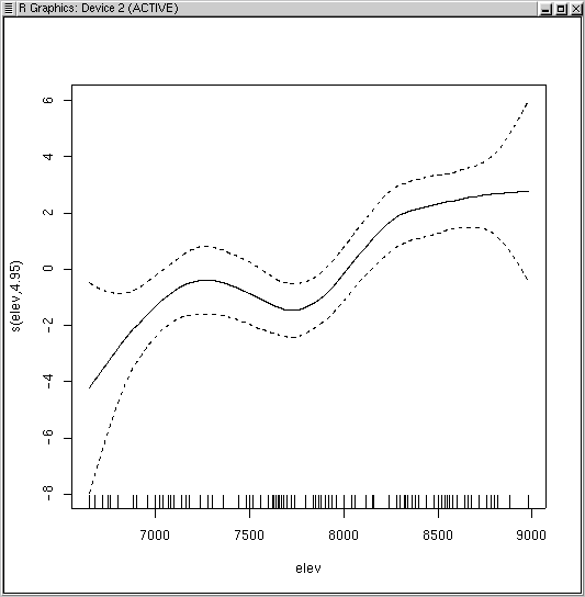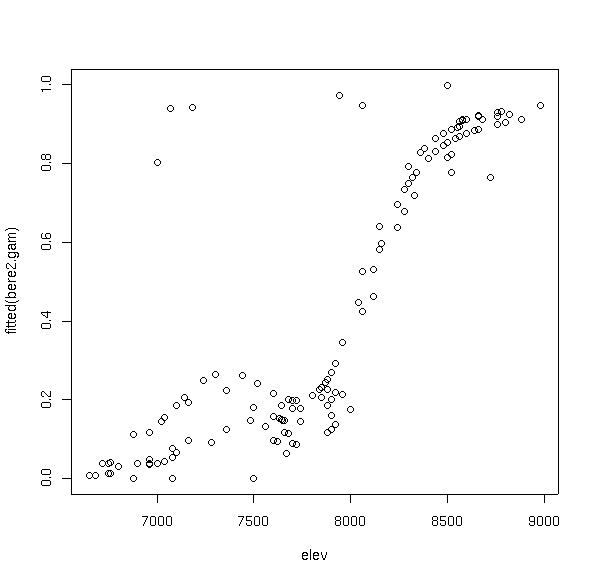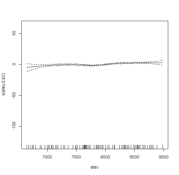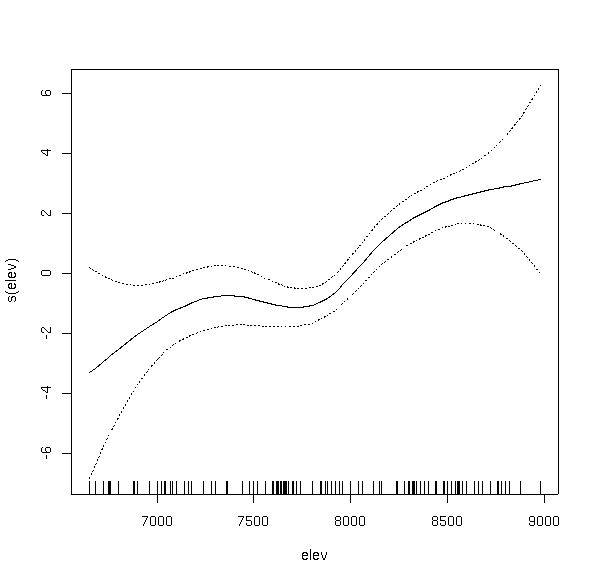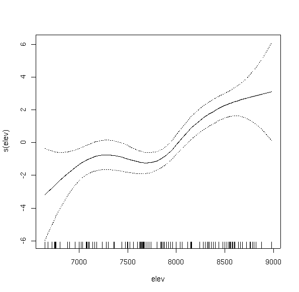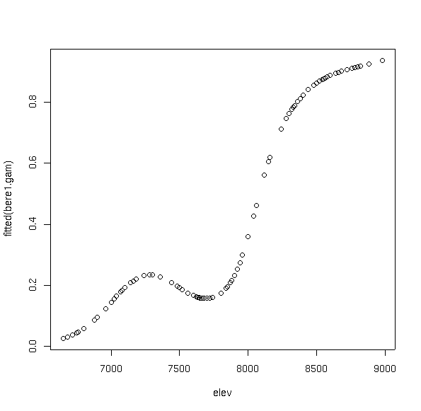 Notice how the curve has multiple inflection points and modes, even though we did not specify a high order function. This is the beauty and bane of GAMs. In order to fit the data, the function fit a bimodal curve. It seems unlikely ecologically that a species would have a multi-modal response to a single variable. Rather, it would appear to suggest competitive displacement by some other species from 7300 to 8000 feet, or the effects of another variable that interacts strongly over that elevation range.