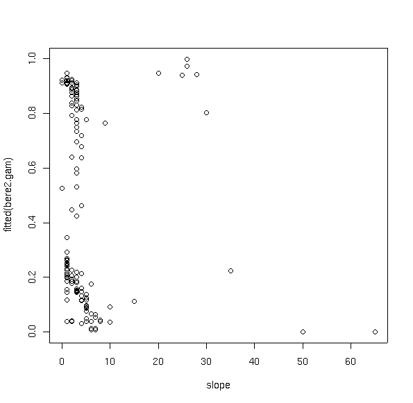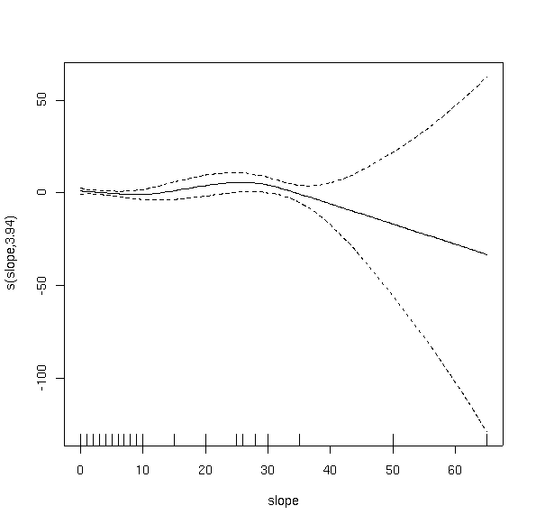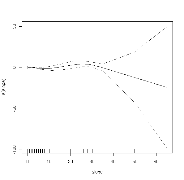 The other aspect of GAMS that is different is that they don't handle interaction well. Rather than fit multiple variables simultaneously, the algorithm fits a smooth curve to each variable and then combines the results additively, thus giving rise to the name "Generalized Additive Models." The point is minimized here, somewhat, in that we never fit interaction terms in our GLMs in the previous lab. For example, it is possible that slope only matters at some range of elevations, giving rise to an interaction of slope and elevation. In practice, interaction terms can be significant, but often require fairly large amounts of data. The Bryce data set is relatively small, and tests of interaction were generally not significant.