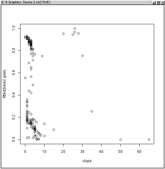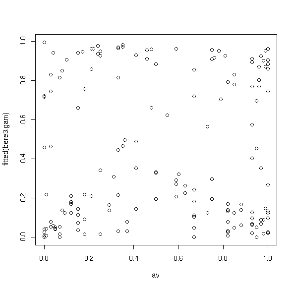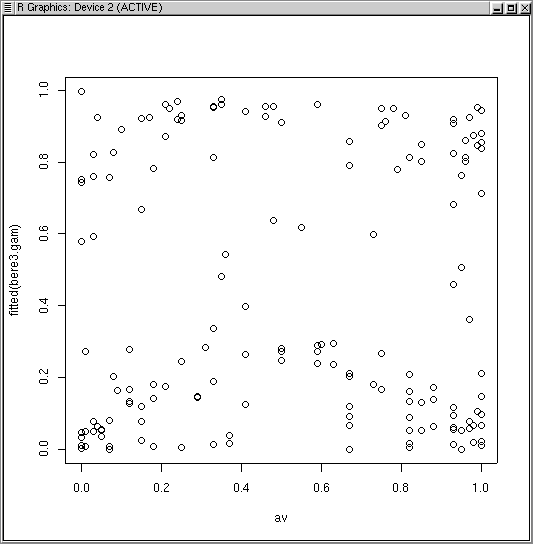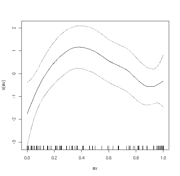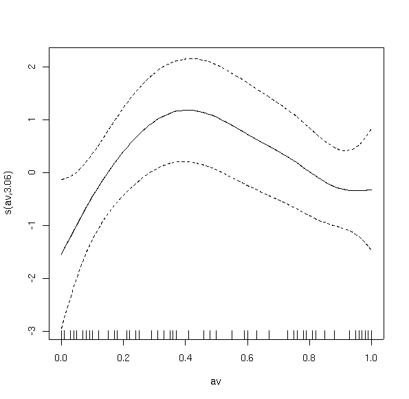 anova.gam(bere3.gam,bere2.gam,test='Chi') Analysis of Deviance Table Model 1: berrep > 0 ~ s(elev) + s(slope) + s(av) Model 2: berrep > 0 ~ s(elev) + s(slope) Resid. Df Resid. Dev Df Deviance P(>|Chi|) 1 144.8843 95.407 2 149.4435 108.700 -4.5593 -13.293 0.015