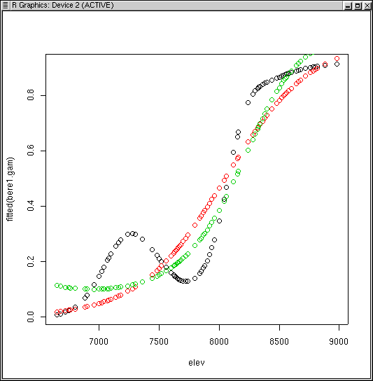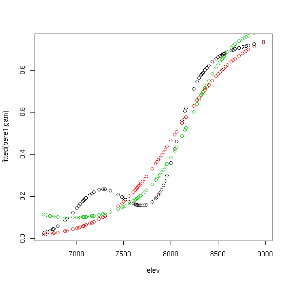 points(elev,fitted(bere1.glm),col=2) points(elev,fitted(bere3.glm),col=3)
