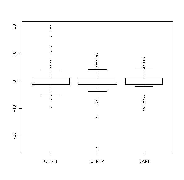 While this probability is not strictly correct for a non-nested test, I think it's safe to say that the GAM is a better fit. In addition, the AIC results are in agreement. One approach to a simple evaluation is to compare the residuals in a boxplot.