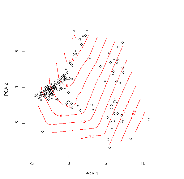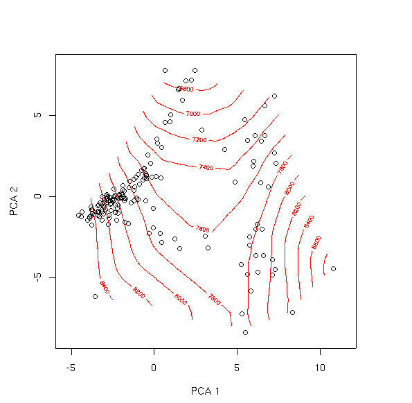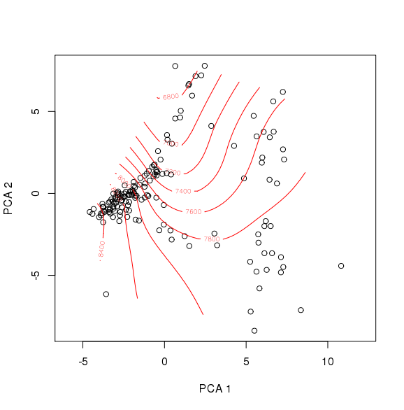 contour(interp(pca.1$scores[,1],pca.1$scores[,2],fitted(elev.pca.glm)),