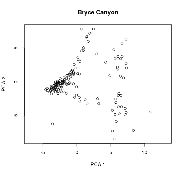 calculates a principal components analysis of the Bryce Canyon vegetation, using a correlation matrix and only calculating scores for the first 10 eigenvectors. The results of a PCA are complex, including: