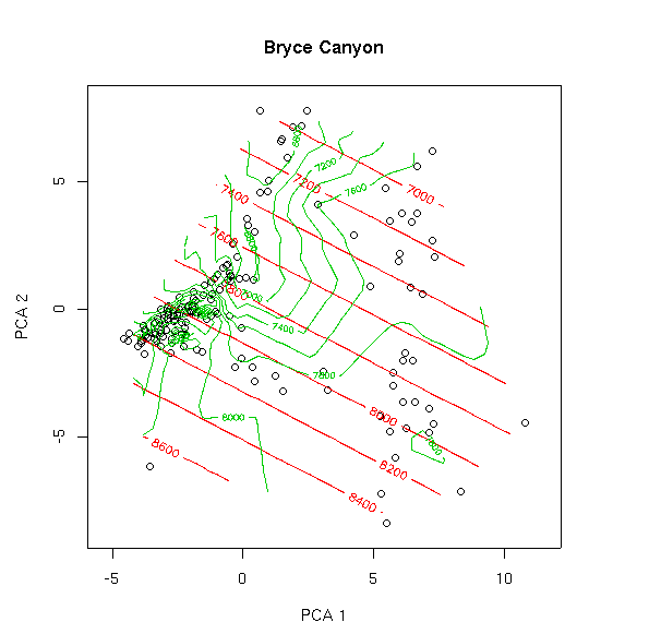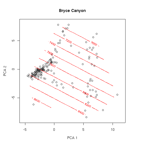 In our example, the first two axes (pca.1$scores[,1] and pca.1$scores[,2]) describe only about 12% of the total variance, but we'll start with a 2-dimensional approach and go from there. Based on our previous results, we might hypothesize that elevation plays a big role in the distribution of vegetation in Bryce Canyon. Let's look: