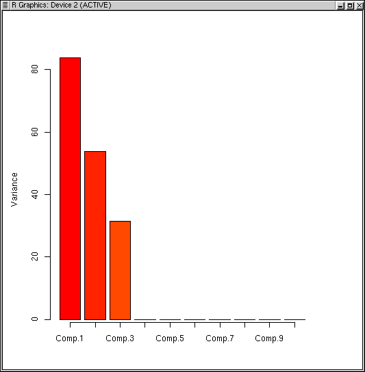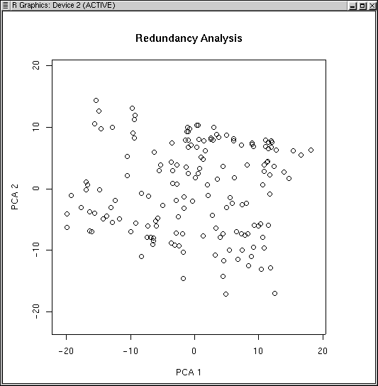 These scores are what is typically plotted in a PCA "ordination." This is easily done with the plot() function. The LabDSV library includes a special version of the plot function for PCA. In S-Plus and R the default plot function plots the barplot of variances, but ecologists are usually more interested in the plot scores. The LabDSV plot function for PCA is designed to simplify plotting, minimizes typing, and most important, attempts to scale the axes identically so that we can compare distances within the ordination without distortion. Unfortunately, R/S does not always understand the exact aspect ratio of computer monitors, and so plots may not be exactly square. Generally, they're close enough, and hardcopy output will be exact.