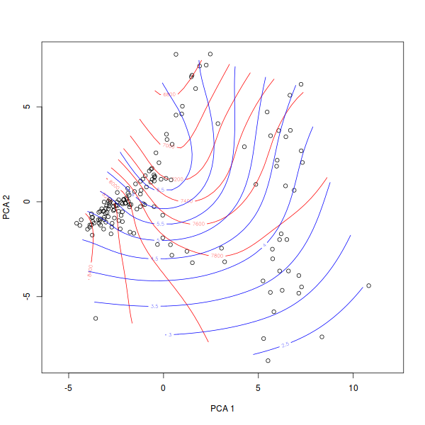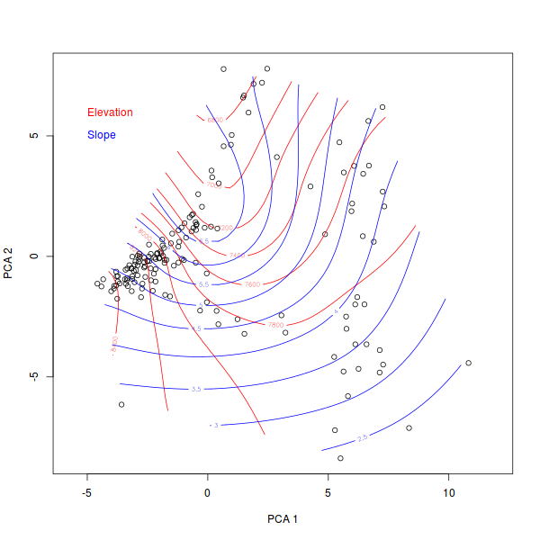 plot(pca.1) surf(pca.1,elev,labcex=1.0) surf(pca.1,slope,col=4,labcex=1.0)