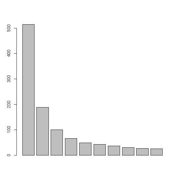 says "calculate the first ten eigenvalues of the veg.euc distance matrix, and store the plot coordinates and eigenvalues." The reduction in dimensionality is shown by the relative values of the eigenvalues, which we can plot as shown
