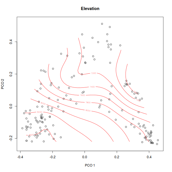 We can fit other environmental variables similarly, and compare the fits by analysis of D^2. Our D^2 square for elevation was 0.870, which is really pretty high. The best we could do with PCA was 0.610. Let's look at some others.