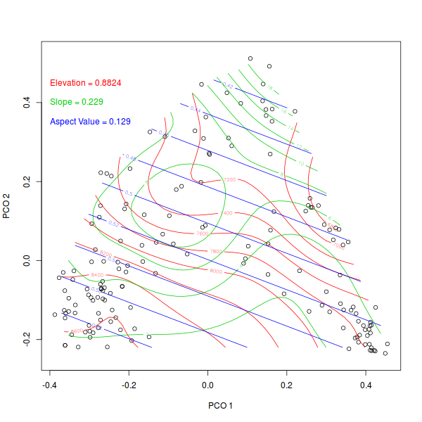 I haven't included the full output from the surf commands to save space, but the respective D^2s are 0.870, 0.162, and 0.026 for elevation, slope, and aspect value respectively. Slope does probably matter in the ordination, but aspect value clearly does not.