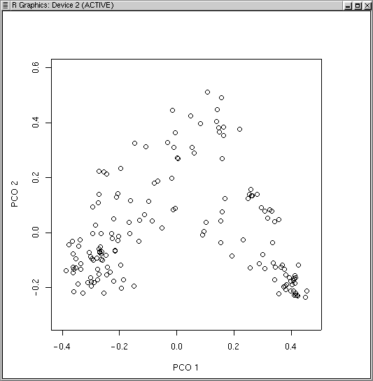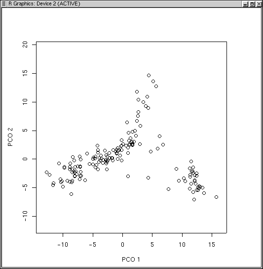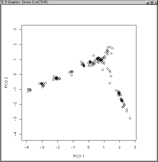 R uses a function called cmdscale() to calculate what it calls "classical multi-dimensional scaling", a synonym for principal coordinates analysis. To make our work easier and more comparable to other techniques, we will use a LabDSV function called pco() which simply calls cmdscale with specific arguments, and provides more convenient plotting routines.
