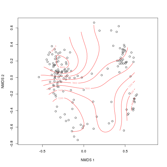 That's a small increase in D^2 compared to the PCO (D^2 = 0.846). In my experience, the better configuration of NMDS generally leads to better fits of environment variables compared to PCO. Twenty tries from random starts produced one result with slightly lower stress than the PCO start.