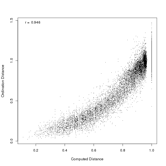 How good a job does NMDS do? Well, one way to determine this is to look at the correlation between the calculated dissimilarities and the plotted values (after all, that's what it's trying to maximize). We can do that with the LabDSV ordcomp() function.